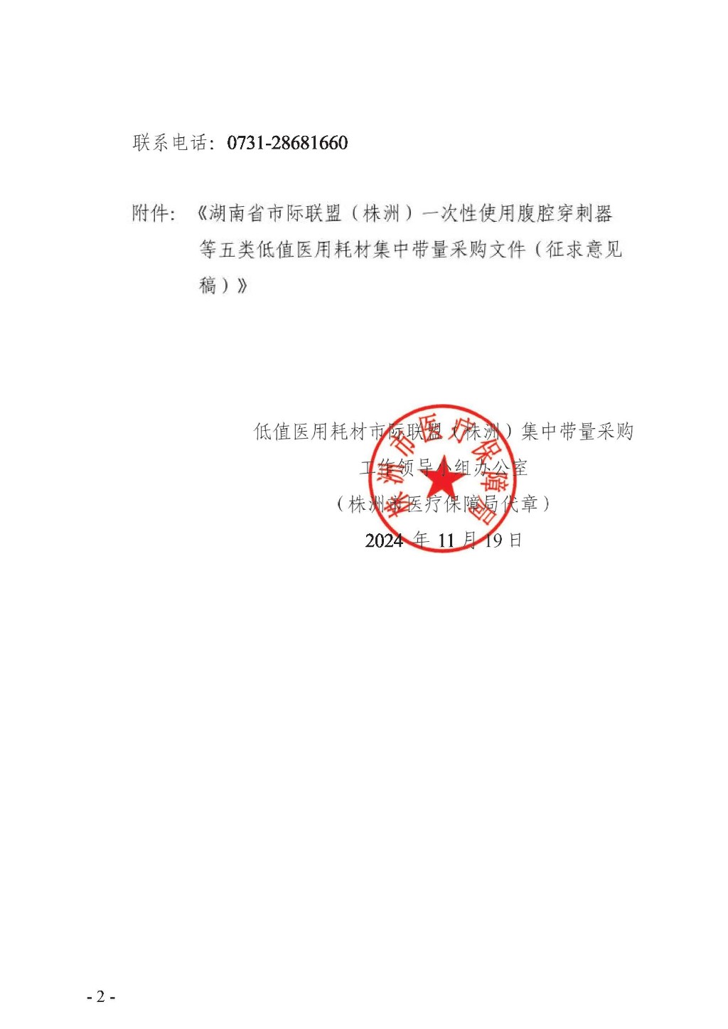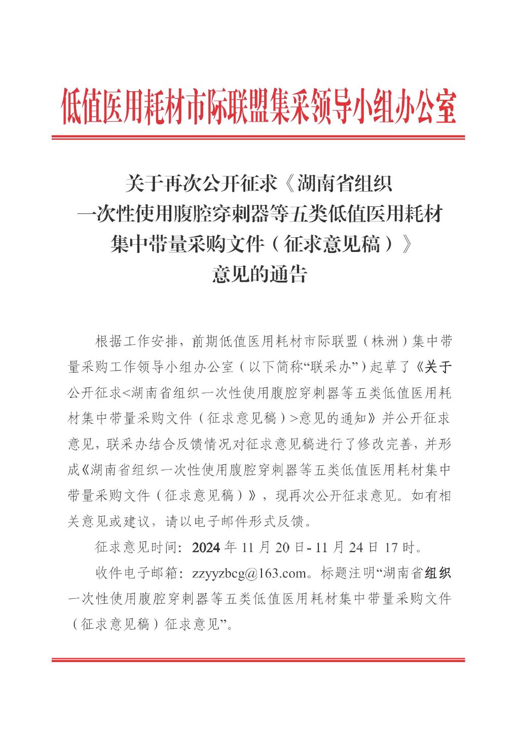关于再次公开征求《湖南省组织一次性使用腹腔穿刺器等五类低值用耗材集中带量采购文件(征求意见稿)》意见的通告